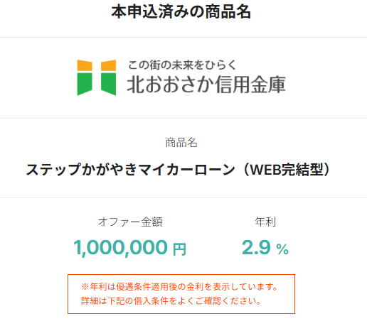 저의 경우 자동차대출로 100만엔 심사신청 하였고, 하루 정도 뒤에 심사통과 연락 및 4군데의 은행을 제안 해 주었습니다.