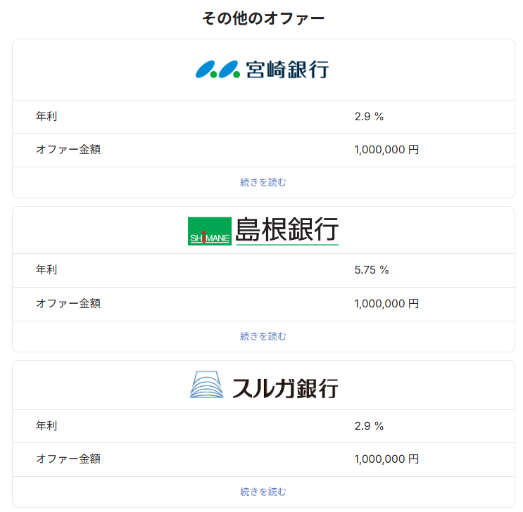 미야자키 은행 이자 2.9%, 시마네은행 5.75%, 스루가은행 2.9%, 키타오사카신용금고 2.9%